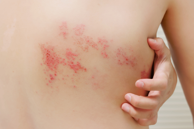 帯状疱疹とは、皮膚のピリピリ、チクチクした痛みに続き、赤い斑点、水ぶくれなどが身体の片側に帯状になって現れる病気です。症例によっては、眠れないほど強く痛むということがあります。